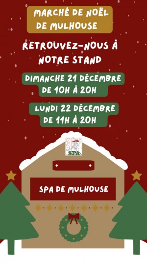 La SPA de Mulhouse sera présente au marché de NOEL de Mulhouse, le dimanche 21 décembre, de 10h à 20h et le lundi 22 décembre, de 11h à 20h, au chalet des associations, Place des Victoires.