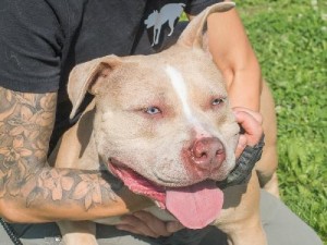 C'est une gentille chienne, plutôt calme, affectueuse, curieuse et joueuse ; elle a tendance à tirer en laisse, il faudra bien prendre cela en considération ; elle s'entend avec ses congénères, il faudra tout de même tester au cas par cas ; l'entente avec les chats est également à tester. Chienne de première catégorie (permis de détention obligatoire, en contrat de garde).