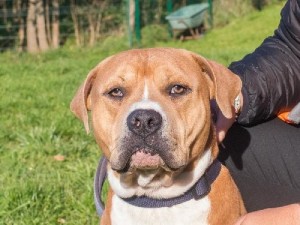 C'est un amour de chien plutôt calme sauf quand il s'amuse ; il fait le fier pour la photo mais c'est un coeur tendre à prendre ; il a beaucoup d'affection à donner (il fait des bisous même quand il ne vous connaît pas) ; il répond aux ordres "assis", "couché" et donne la patte quand on lui demande ; il se montre gourmand et joueur ; il s'entend avec ses congénères, avec les chats c'est à tester. C'est un chien de première catégorie (permis de détention obligatoire, en contrat de garde).