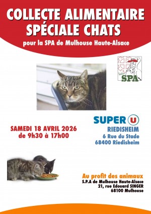 La SPA de Mulhouse Haute-Alsace organise une grande collecte alimentaire au profit de ses pensionnaires félins, le samedi 18 avril 2026, de 9h30 à 17h00 au SUPER U de Riedisheim ; des flyers avec les besoins des Animaux vous seront distribués par nos bénévoles, présents ; ces derniers pourront également répondre à toutes vos questions sur la SPA de Mulhouse.